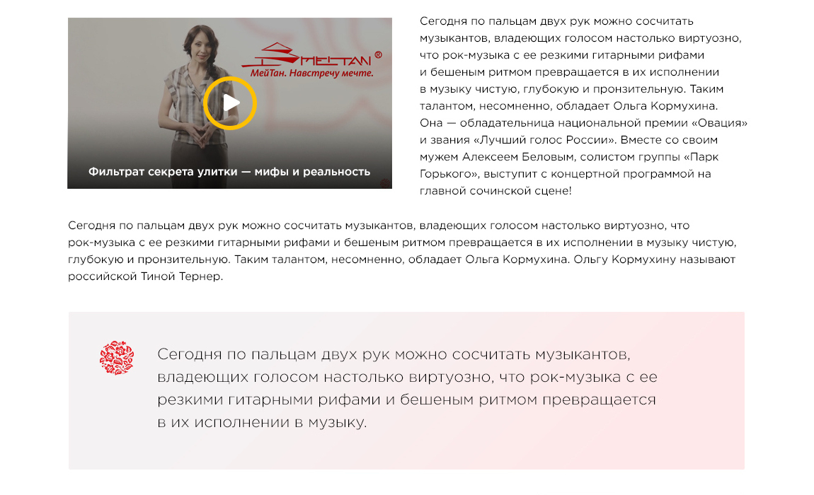 Together with the customer, we thought out which blocks to draw: image, text, fact, quote, tag, video. In the administrative panel, it is easy to assemble a page from ready-made blocks that look good and, most importantly, does not require any additional time and external specialists to create it.