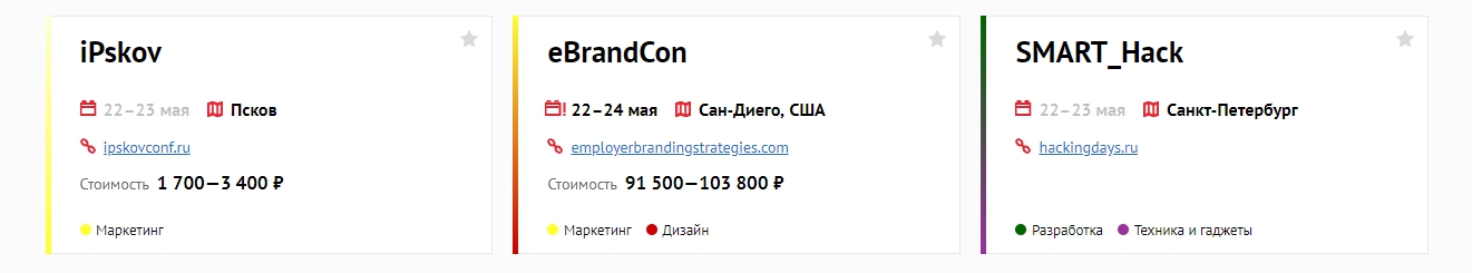 Event cards pop-up Windows with a unique URL and navigation to switch between them. From the card, you can go to the organizer's website: view the program or go to the registration page.